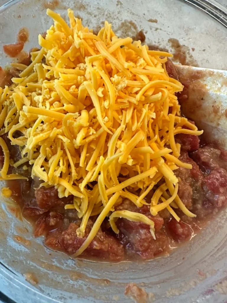 Combine all the ingredients in a medium bowl: the beans, the Rotel, and half the cheese.
