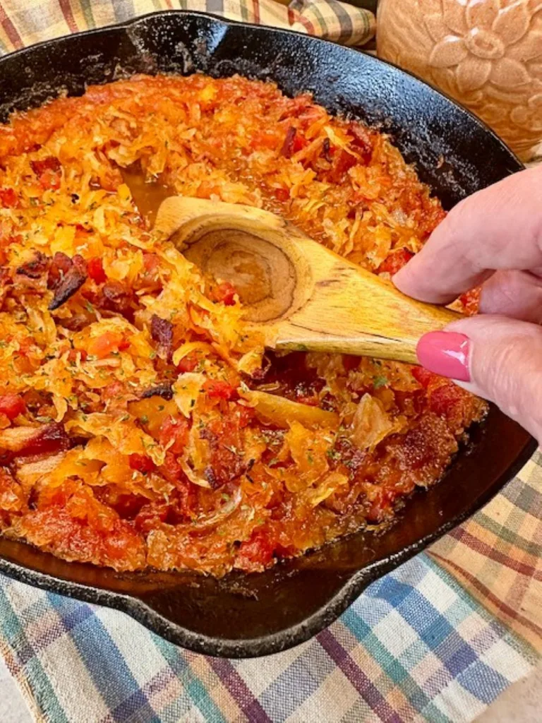 I am super stoked to make this recipe!! I pulled out my jar of sauerkraut and was thinking of 2hat i could make with it.... I just canned so many tomatoes they are coming out of my ears. So thankfully i can use a jar of them in this recipe! Ill let yall know how it turned out!!!
